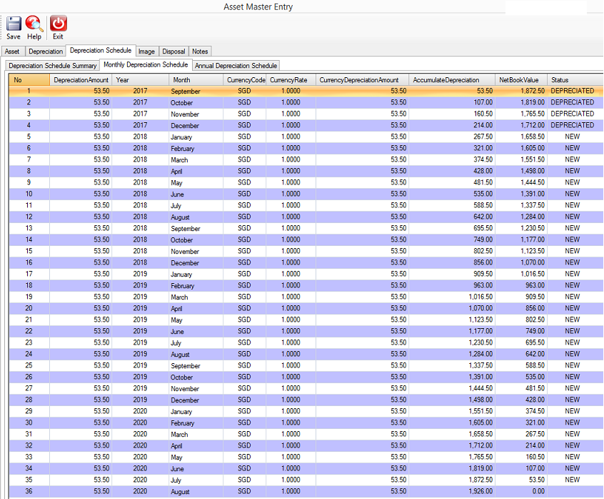 Record newly purchased Fixed Assets, Purchase price, rate, and start date with Print monthly Fixed Asset Schedule.